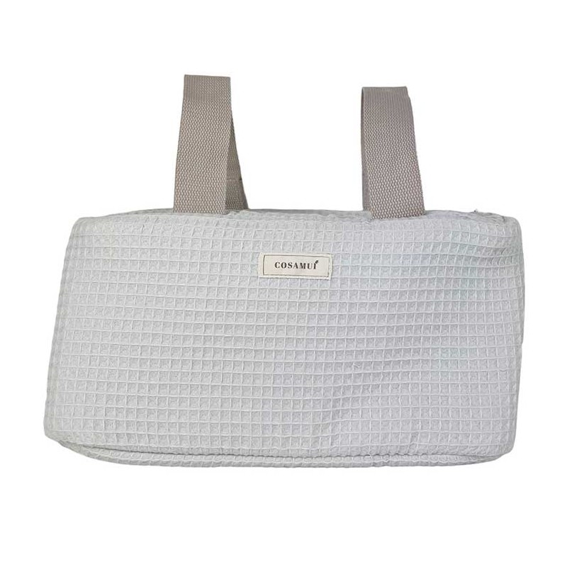 Bolso organizador para carrito de paseo donde puedes llevar lo necesario y no tener que llevar la casa a cuestas. De tejido waffle color gris.