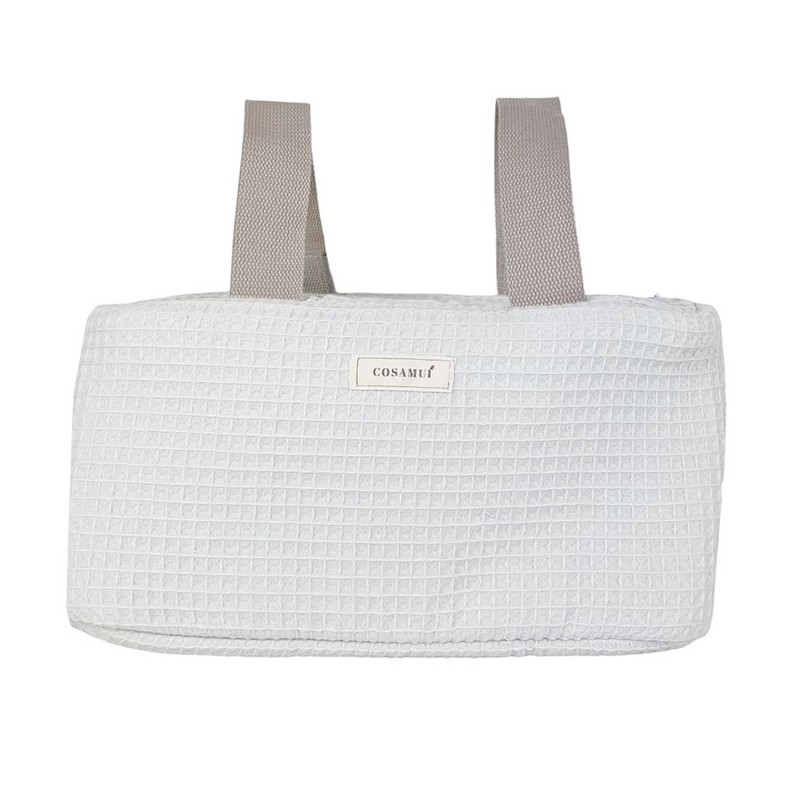 Bolso organizador para carrito de paseo donde puedes llevar lo necesario y no tener que llevar la casa a cuestas. De tejido waffle color blanco.