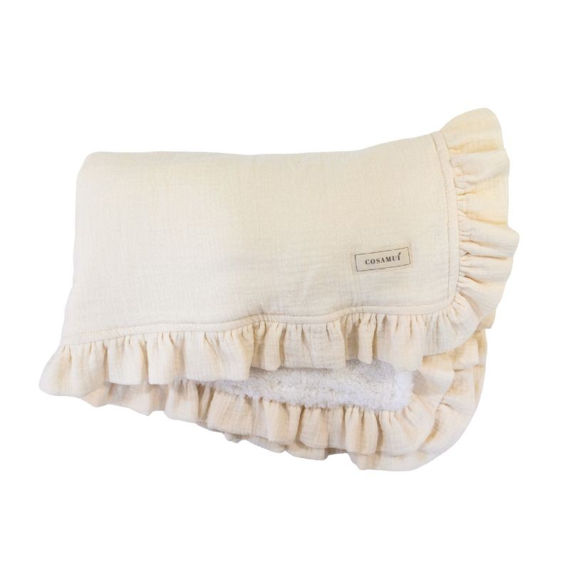 Manta de muselina y borrego con volante de color beige. Para recién nacido, ideal para mantener a tu bebé cómodo y abrigado. Sirve tanto para el carrito o capazo, como para la cuna. Está confeccionada con un interior de borrego ultra suave y un exterior en gasa algodón 100%. Creada y fabricada con la máxima calidad para el confort de tu bebé