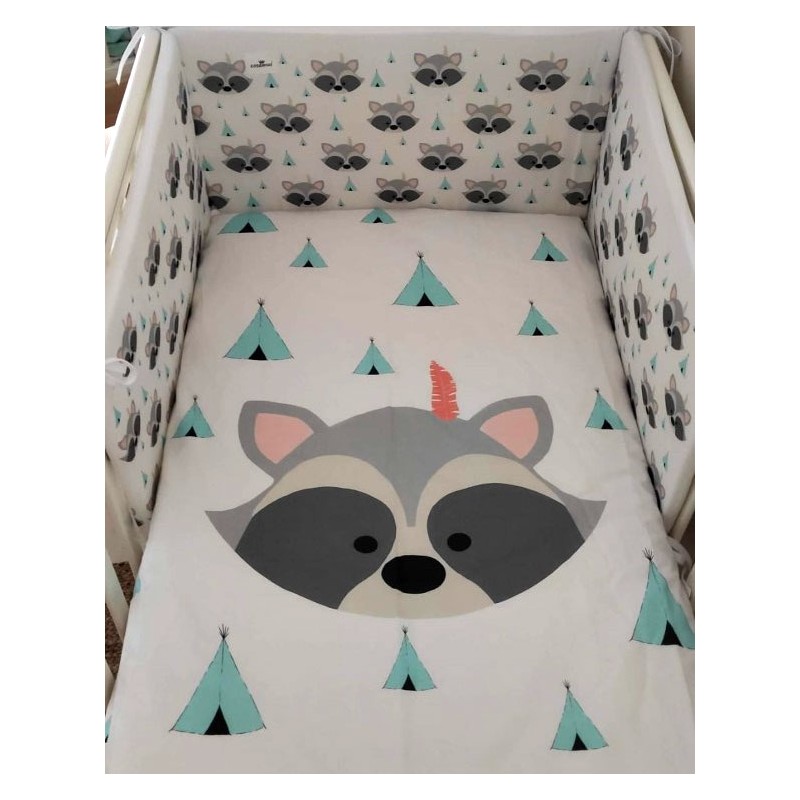 Sábana algodón 100% (200 hilos) para cuna 60x120 o 70x140 de nuestra colección de Mapaches. Medidas 105x135cm o 150x120cm.