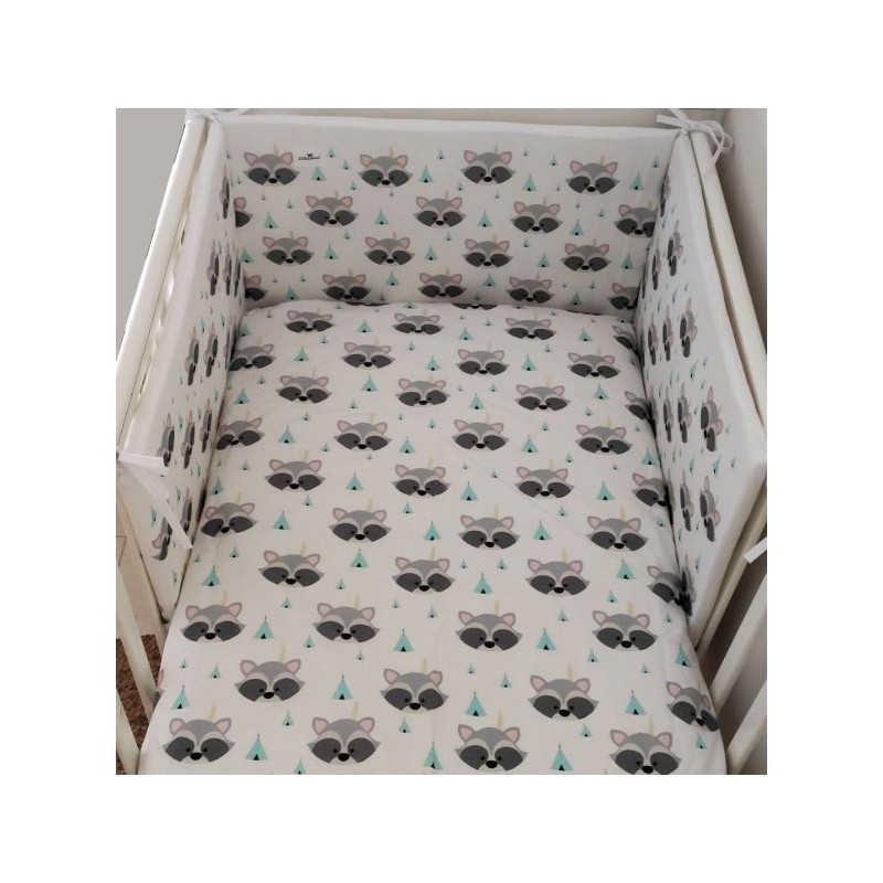 Sábana algodón 100% (200 hilos) para cuna 60x120 o 70x140 de nuestra colección de Mapaches mini. Medidas 105x135cm o 150x120cm.